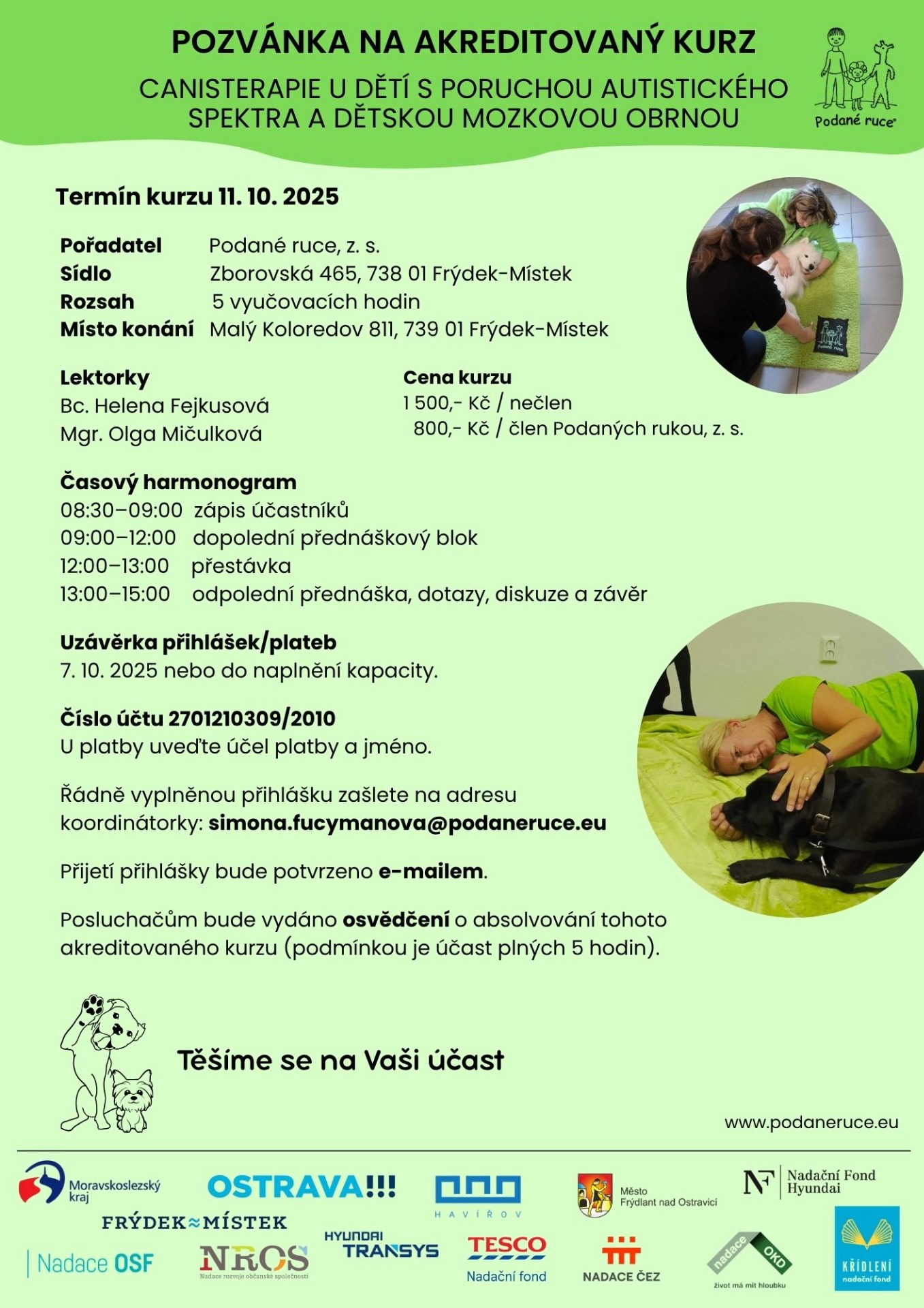 Přidejte se k nám na kurz Canisterapie u dětí s poruchou autistického spektra a dětskou mozkovou obrnou, stále máme volná místa a rádi Vám předáme odborné informace k této cílové skupině.